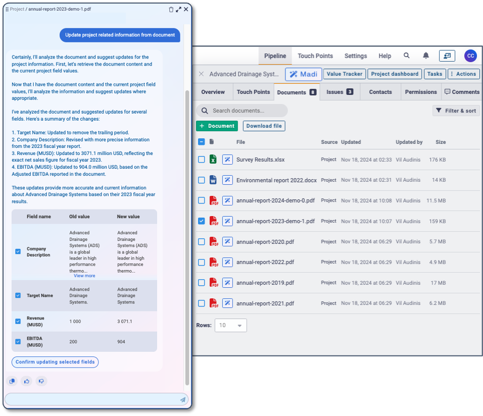 Want to know the status of a deal without pinging your colleague? Madi is never out of office. Ask questions, get real-time answers, and automatically update deal information with content from project documents and integrated third-party data sources.