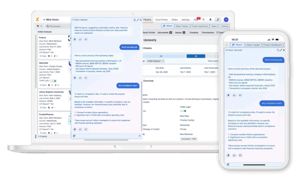 At the heart of Midaxo AI is Madi—your intelligent, always-available teammate. Think of Madi as the Siri or Alexa of M&A: smart, responsive, and purpose-built to simplify your dealmaking. As our customers have started to leverage it more, Madi has become an ace in their back pocket—the partner they didn’t know they needed. Here are just a few ways Madi helps streamline your M&A projects, eliminate repetitive tasks, and increase productivity: