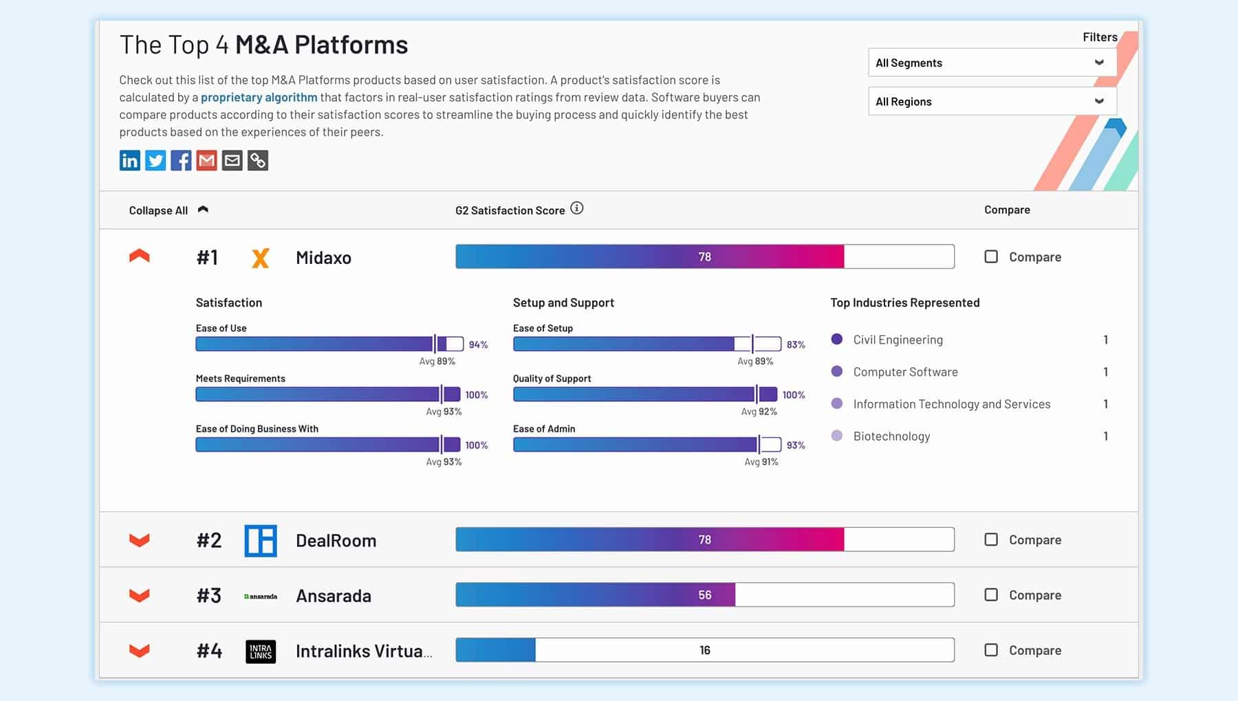 Midaxo is proud to announce it is currently the top M&A platform on G2 based on user reviews, outranking M&A platform competitors such as Intralinks, DealRoom, and Ansarada.