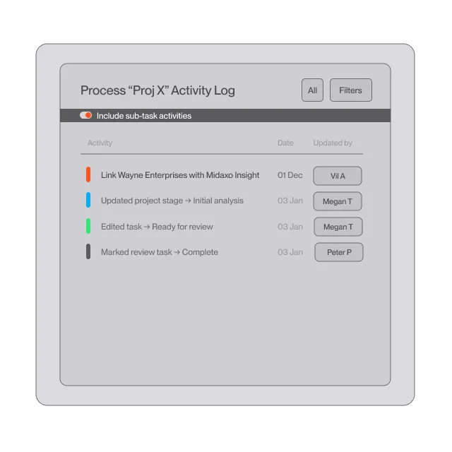 Midaxo enables teams to standardize how M&A gets done. Playbooks, workflows, and templates can be embedded directly into the platform to help teams execute consistently, reduce risk, and onboard new team members faster.